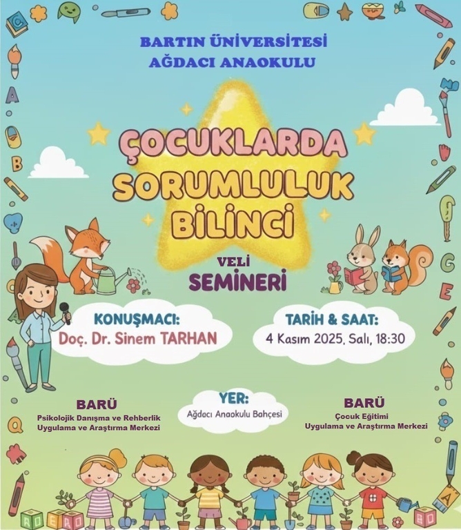 Bartın Üniversitesi Psikolojik Danışma ve Rehberlik Uygulama ve Araştırma Merkezi ile Çocuk Eğitimi Uygulama ve Araştırma Merkezi iş birliğinde Bartın Üniversitesi Ağdacı Anaokulunda bir seminer düzenlenmiştir. Anne-babalara yönelik olarak Doç. Dr. Sinem TARHAN tarafından verilen seminerde çocuklarda sorumluluk gelişimi konusu üzerinde durulmuştur. Seminer anne-babalarla etkileşimli olarak tamamlanmıştır. Anaokulu müdürü Selami ATAMAN başta olmak üzere etkinliğin düzenlenmesinde emeği geçen herkese ve katılan anne-babalara çok teşekkür ederiz.